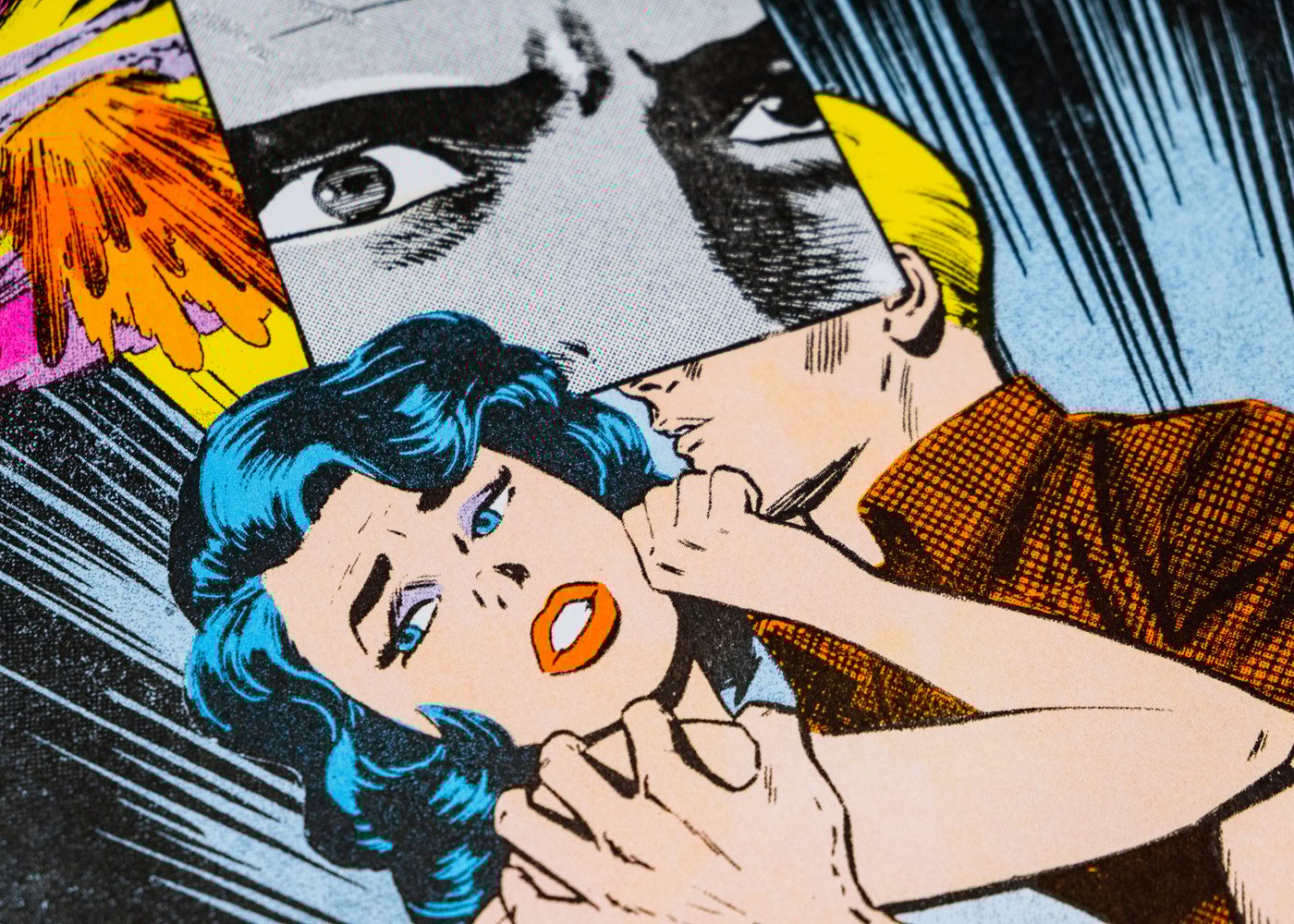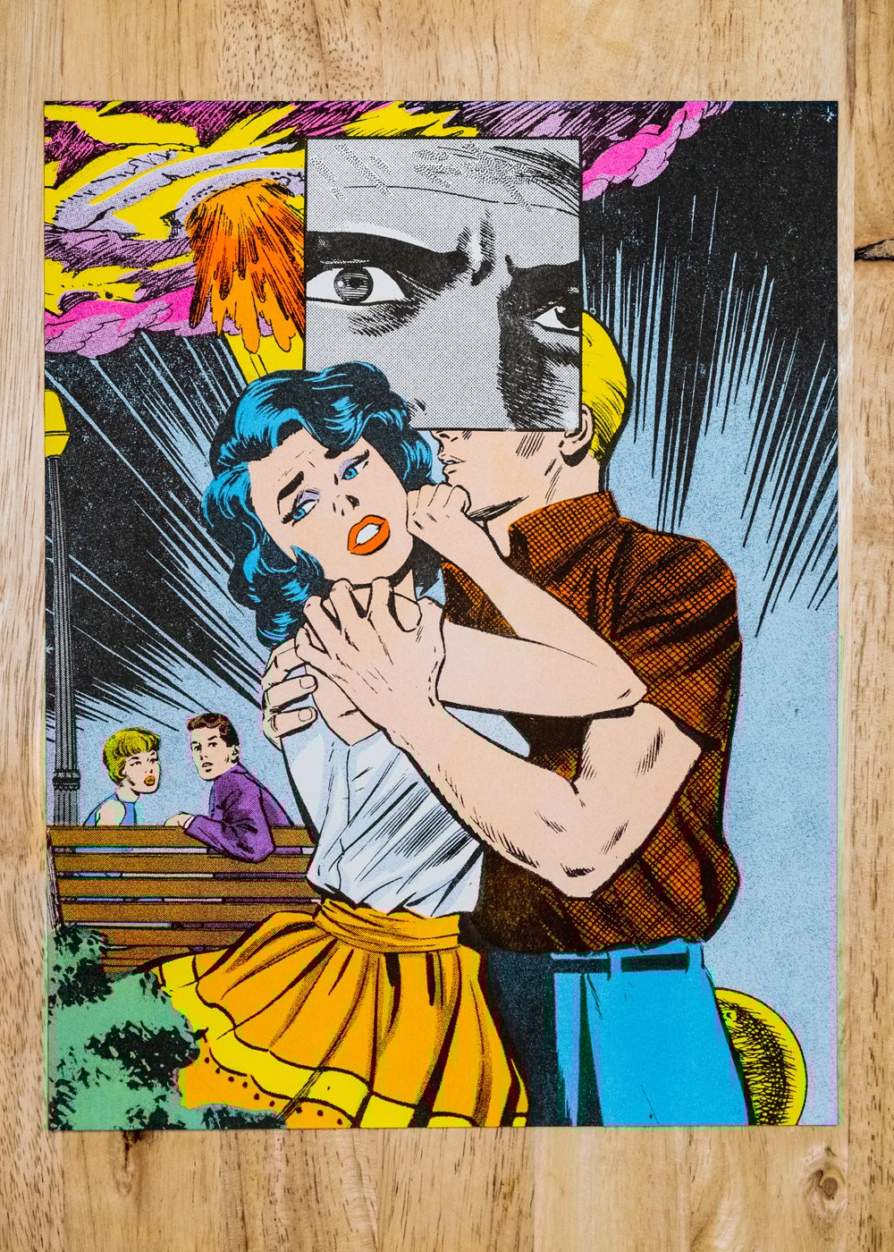 4-color Risograph print (yellow, flo pink, aqua, and black) made from a collage of vintage comics.