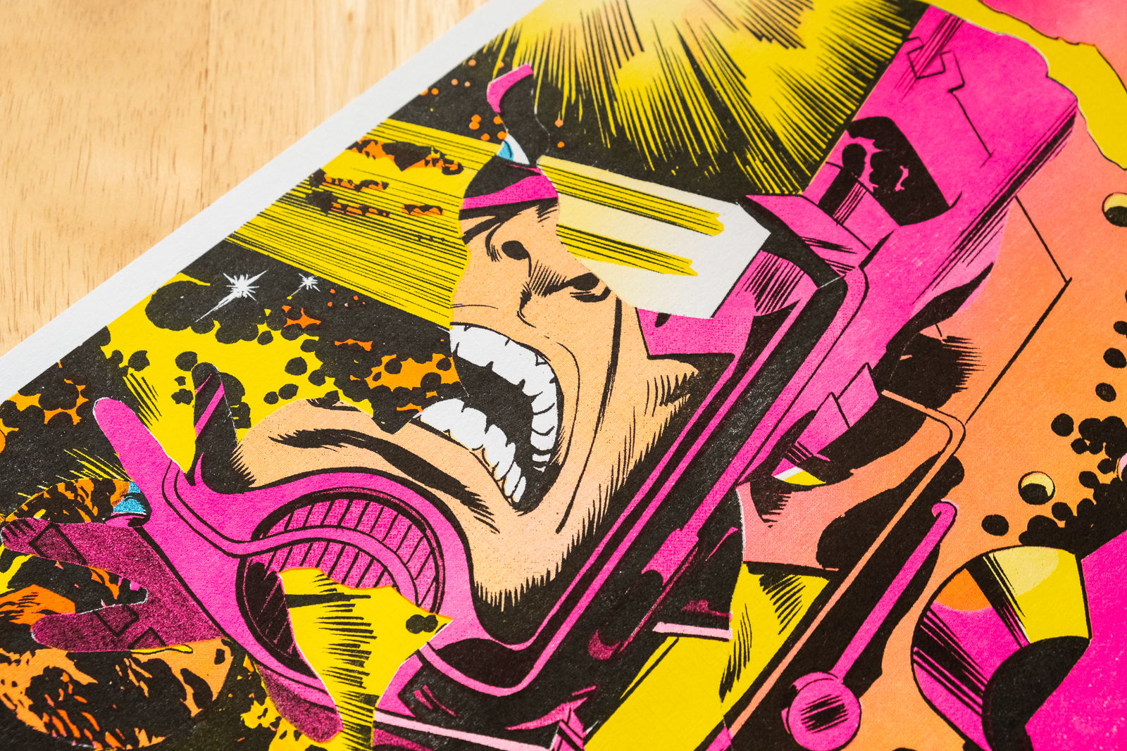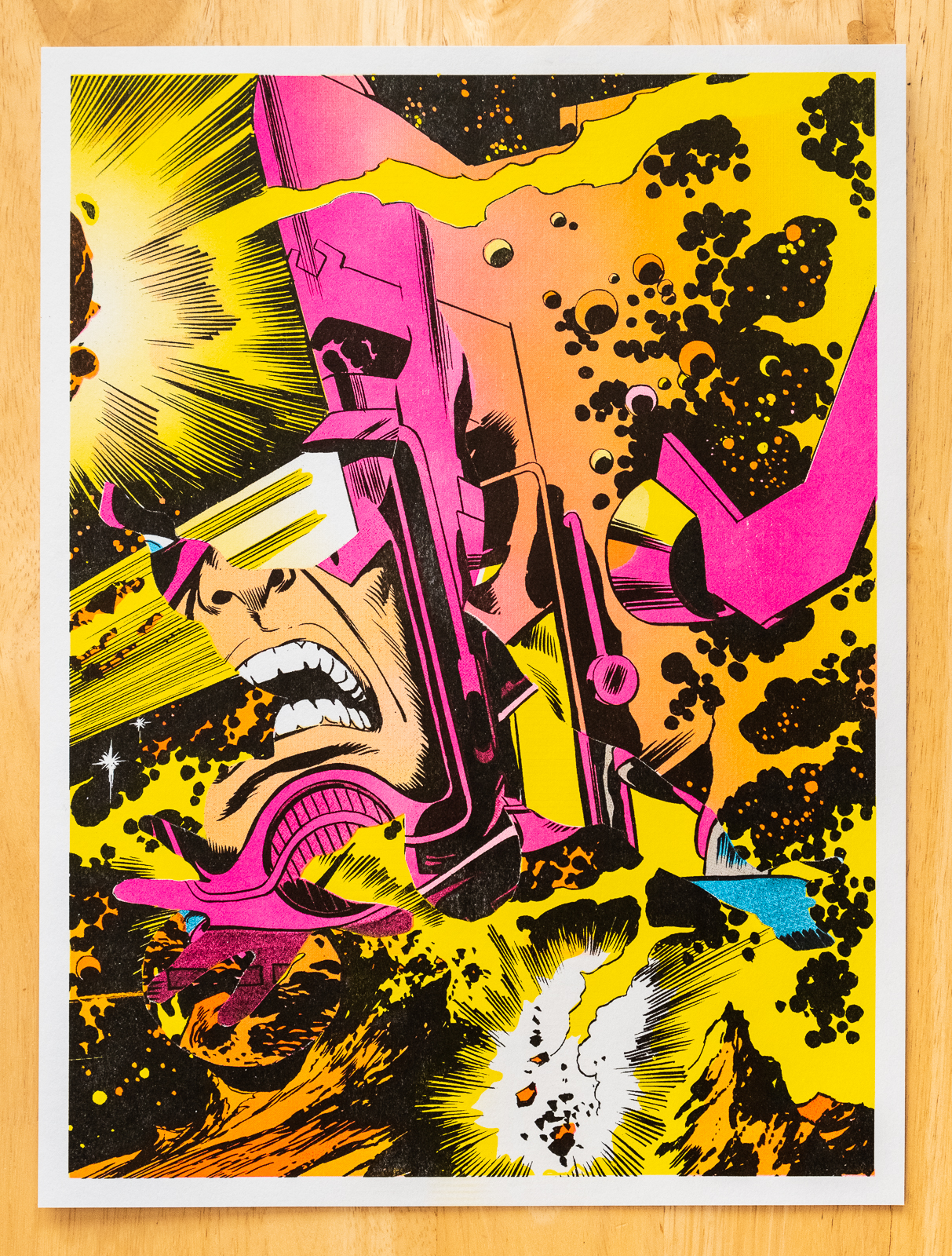 4-color Risograph print (yellow, flo pink, aqua, and black) made from a collage of pages from Silver Surfer: Judgement Day (1988). Printed on gray 67-lb cover weight paper.