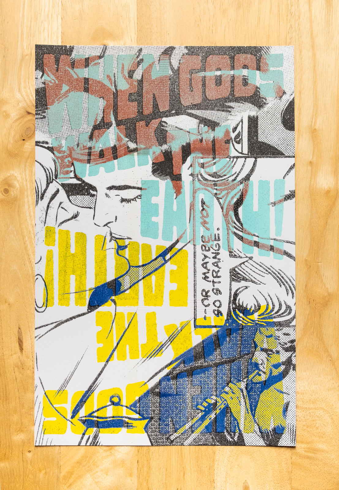 5-color Risograph print (yellow, red, blue, mint, and black) made from a collage of vintage comics.