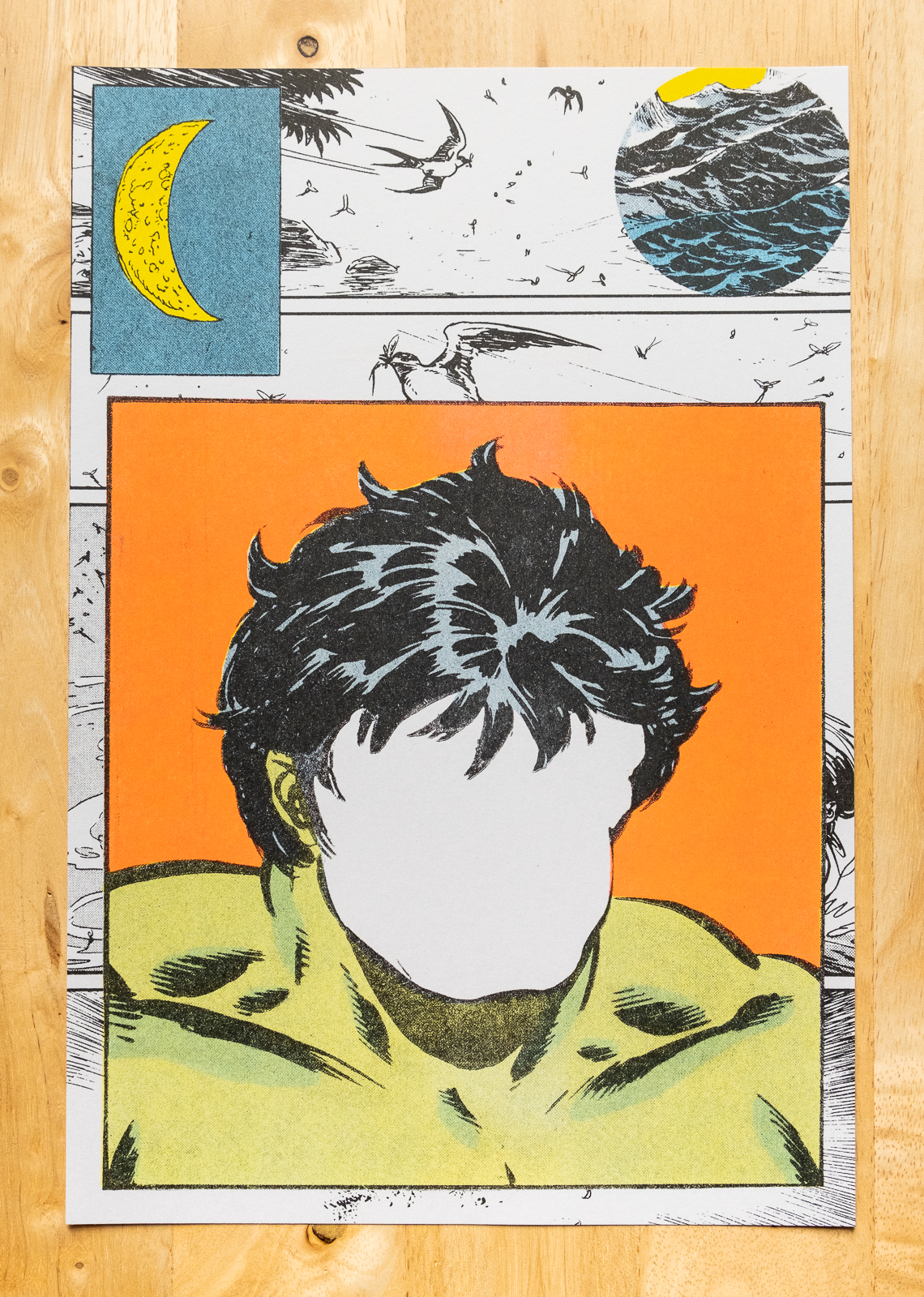 4-color Risograph print (yellow, flo pink, aqua, and black) made from an analog collage of vintage comics.