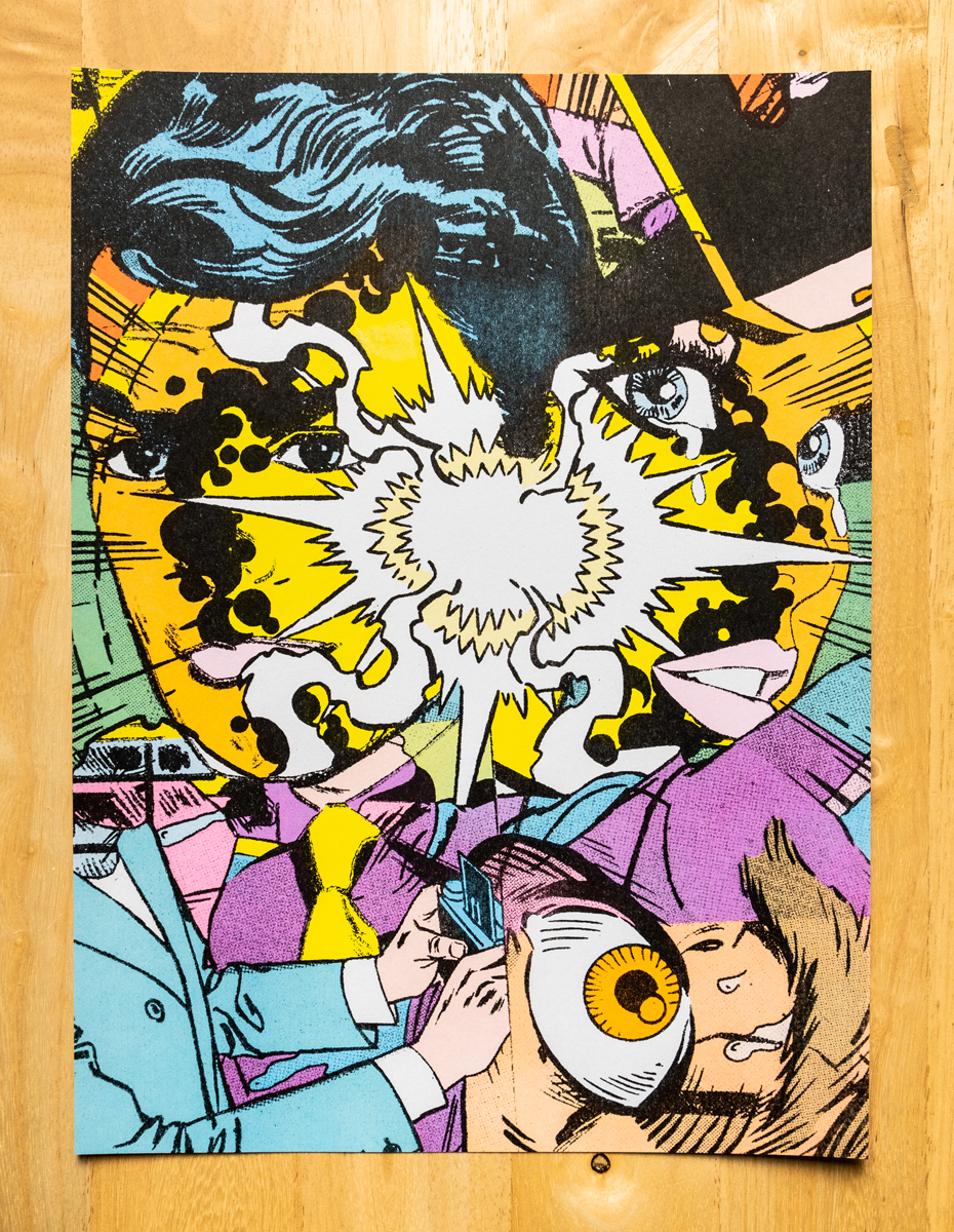 4-color Risograph print (yellow, flo pink, aqua, and black) made from a collage of vintage comics.