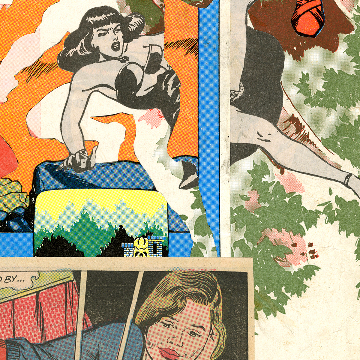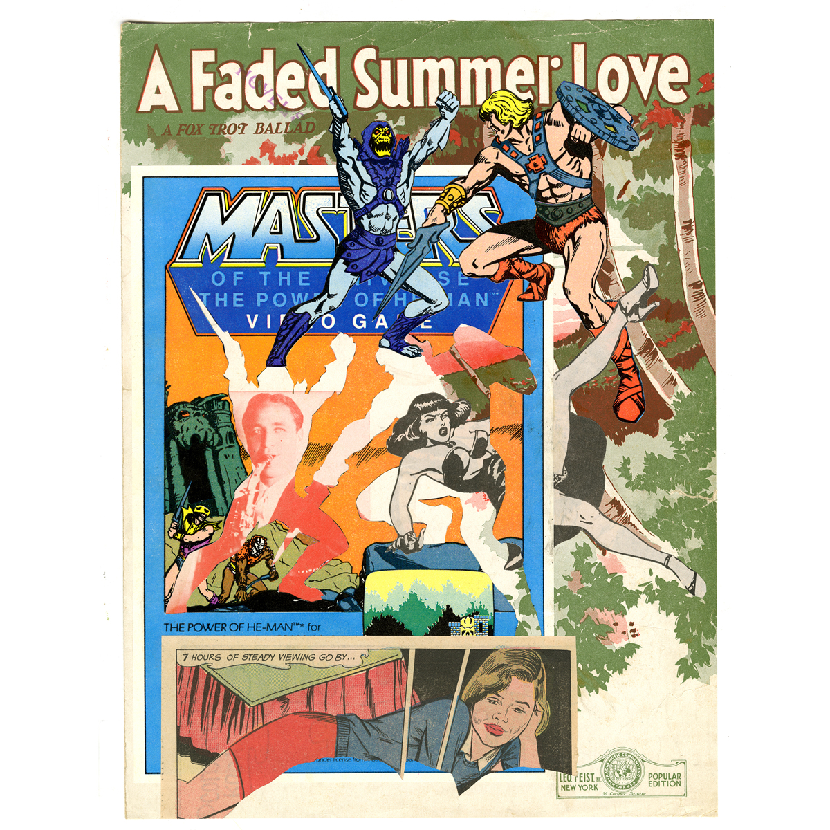 Collage of vintage comic book and sheet music pages. This is an original analog collage and is one of a kind!