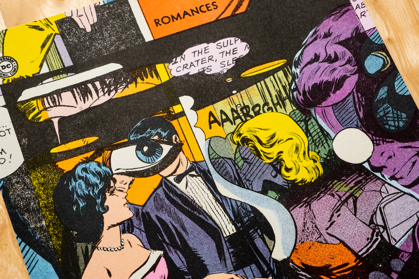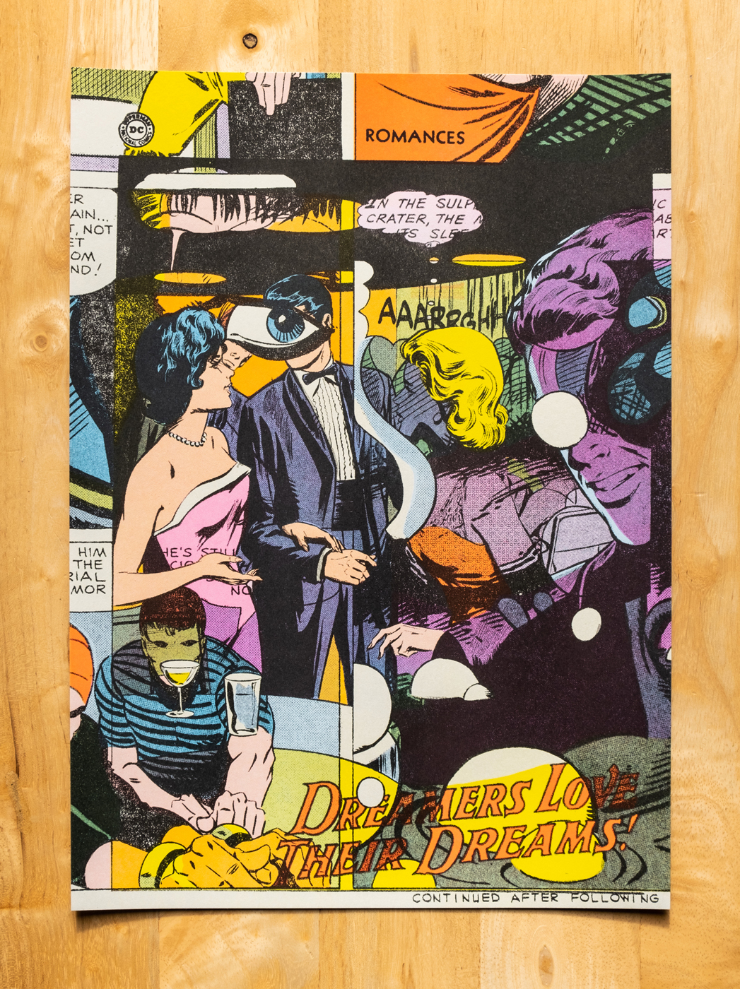4-color Risograph print (yellow, flo pink, aqua, and black) made from a collage of vintage comics.