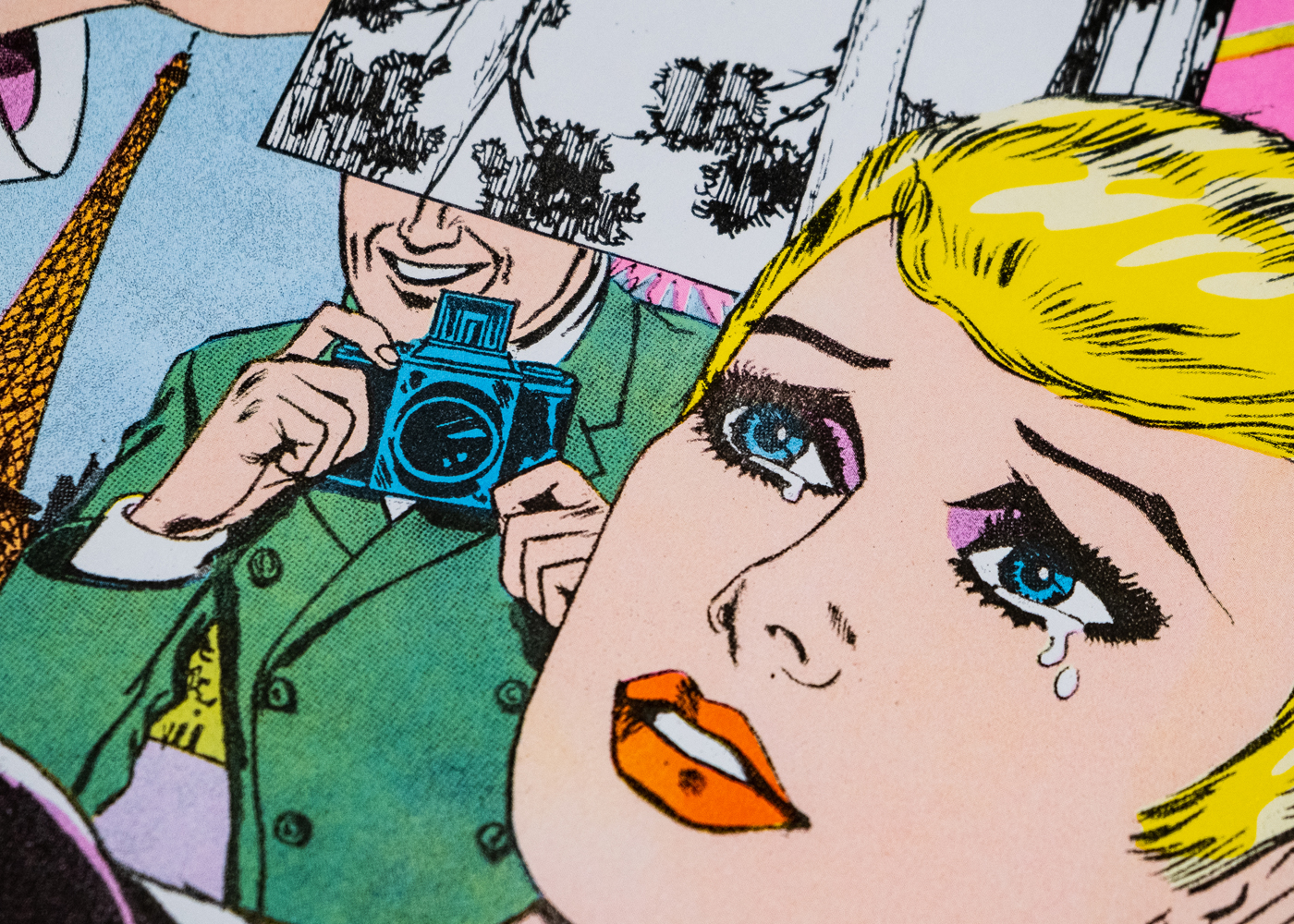 4-color Risograph print (yellow, flo pink, aqua, and black) made from a collage of vintage comics.