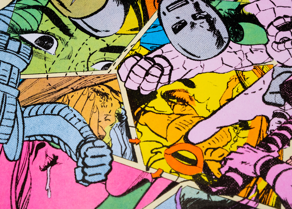 4-color Risograph print (yellow, flo pink, aqua, and black) made from a collage of vintage comics.