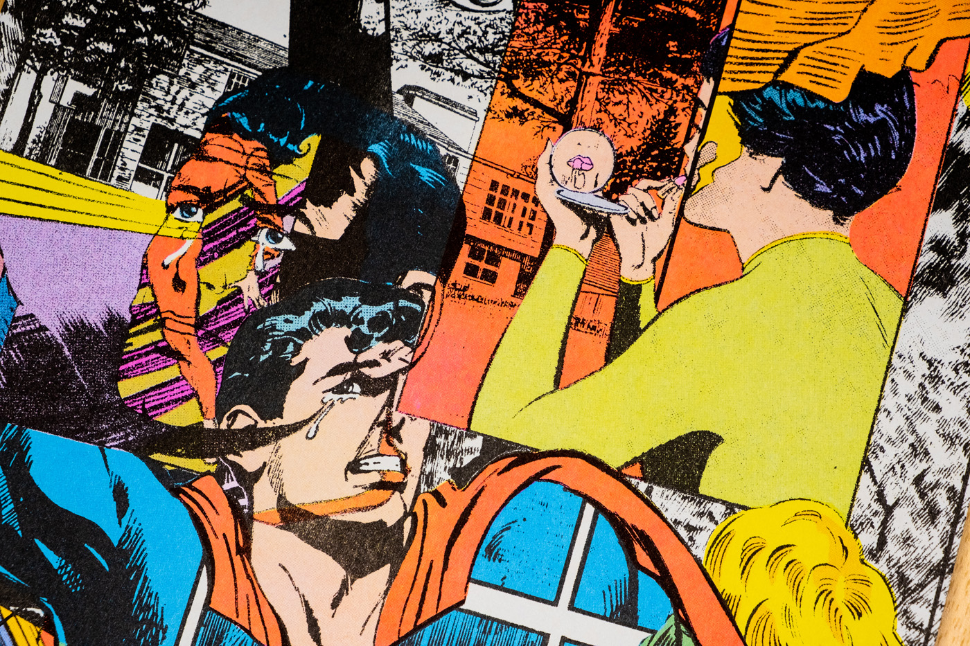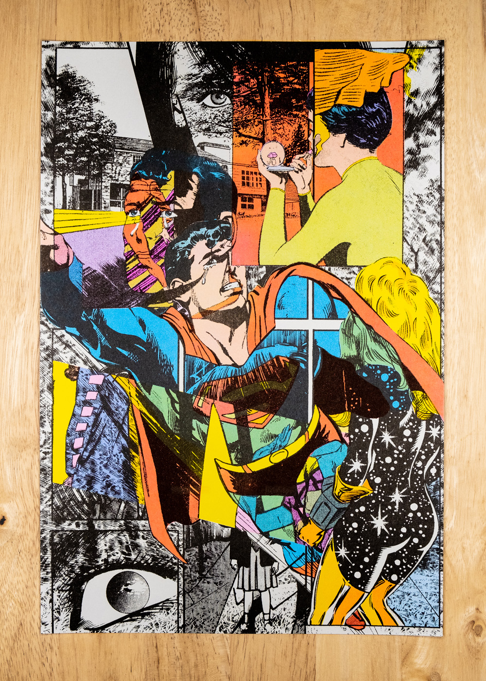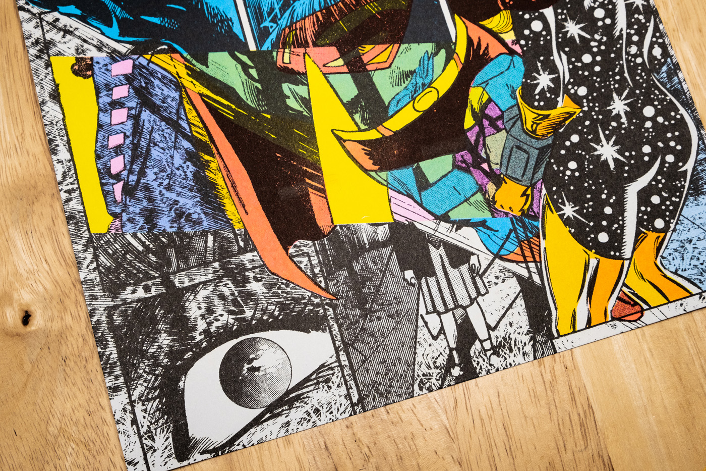 4-color Risograph print (yellow, flo pink, aqua, and black) made from a collage of vintage comics.