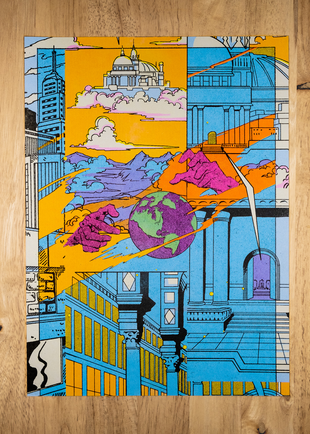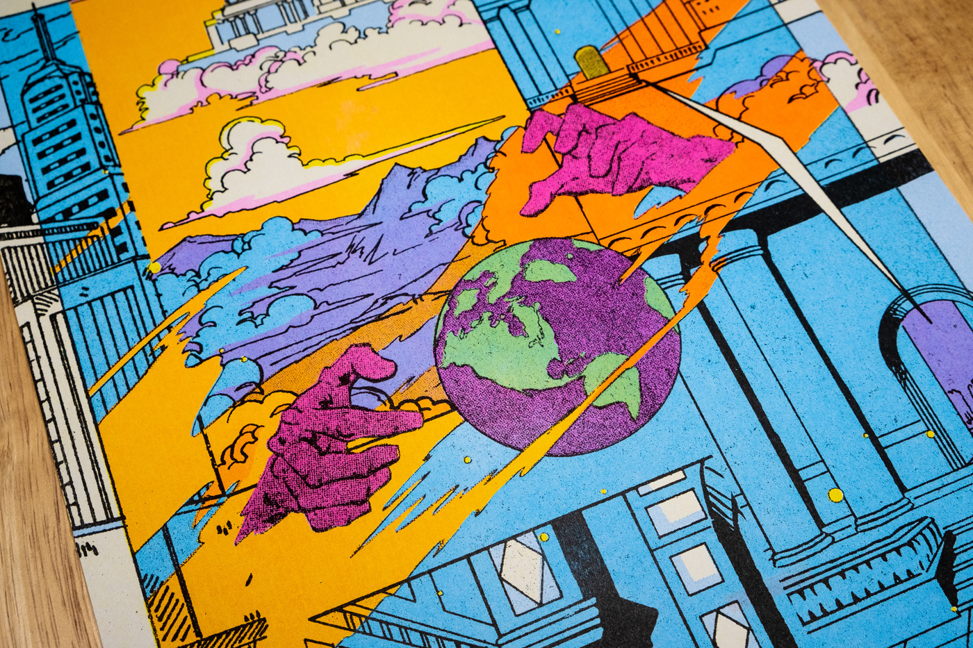 4-color Risograph print (yellow, flo pink, aqua, and black) made from a collage of vintage comics.