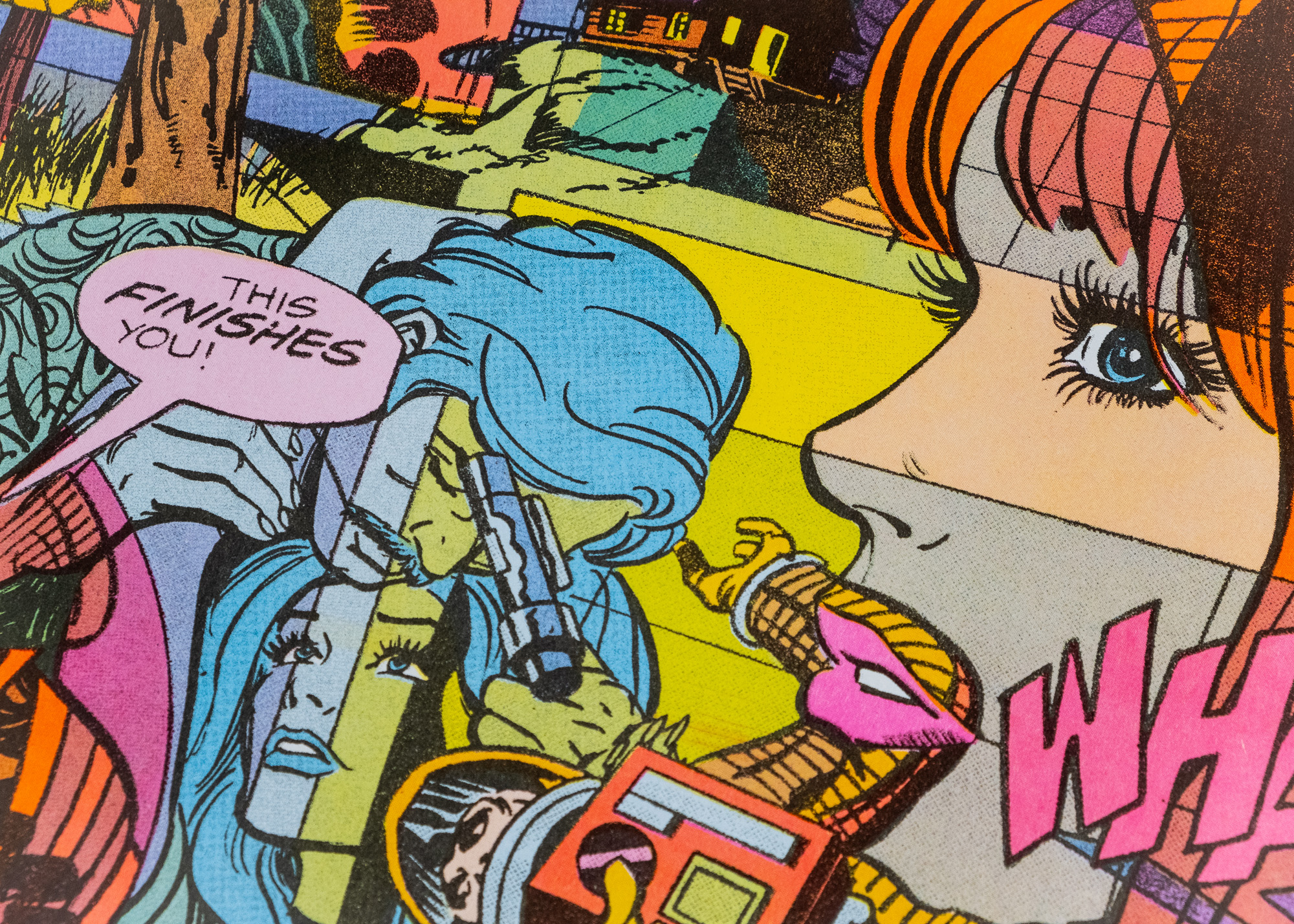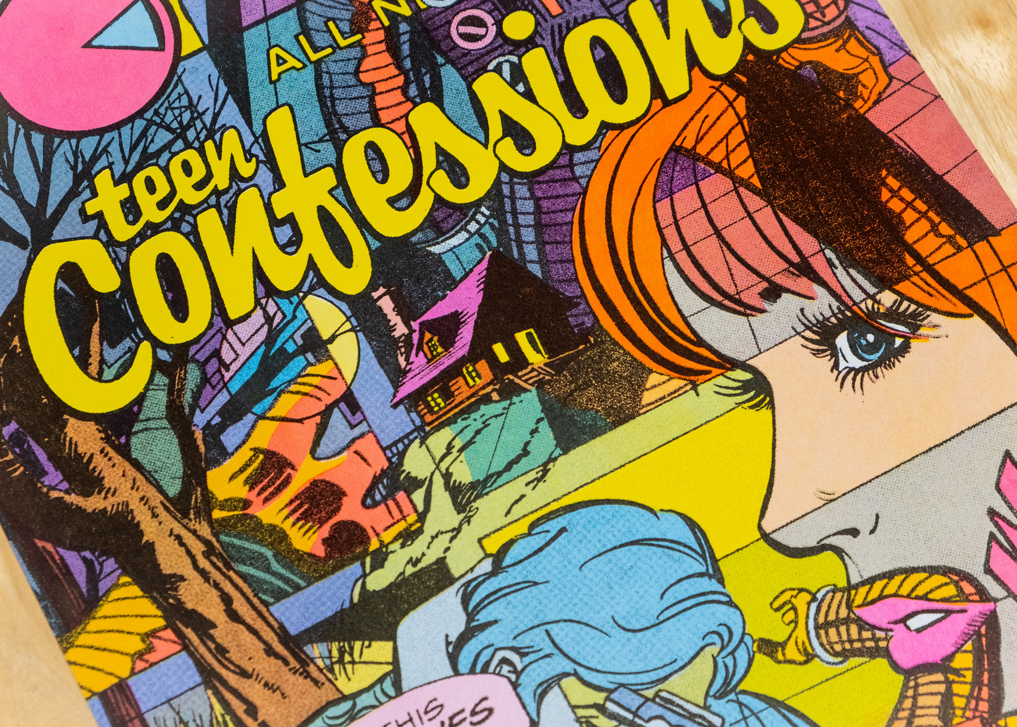 4-color Risograph print (yellow, flo pink, aqua, and black) made from a collage of vintage comics.