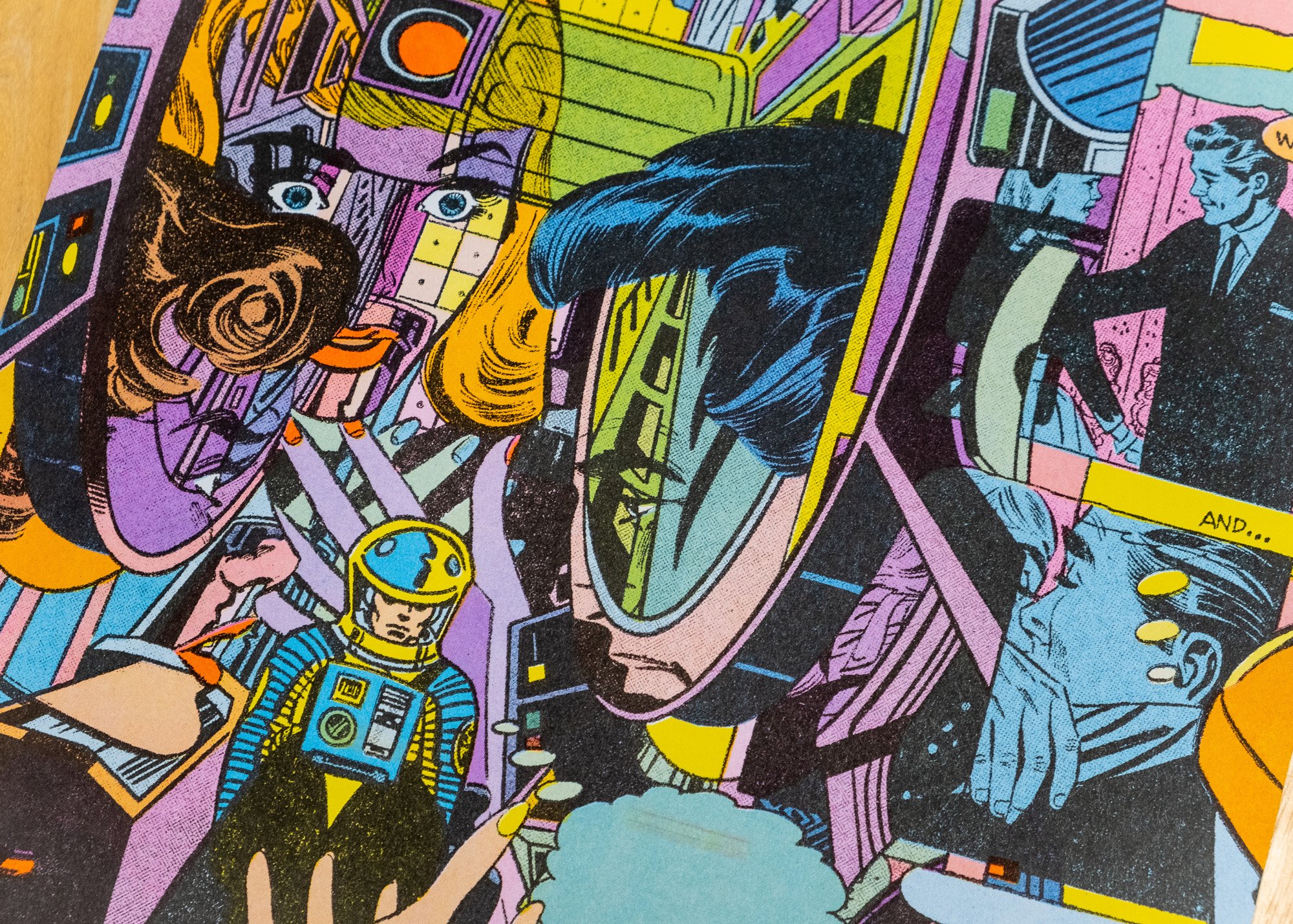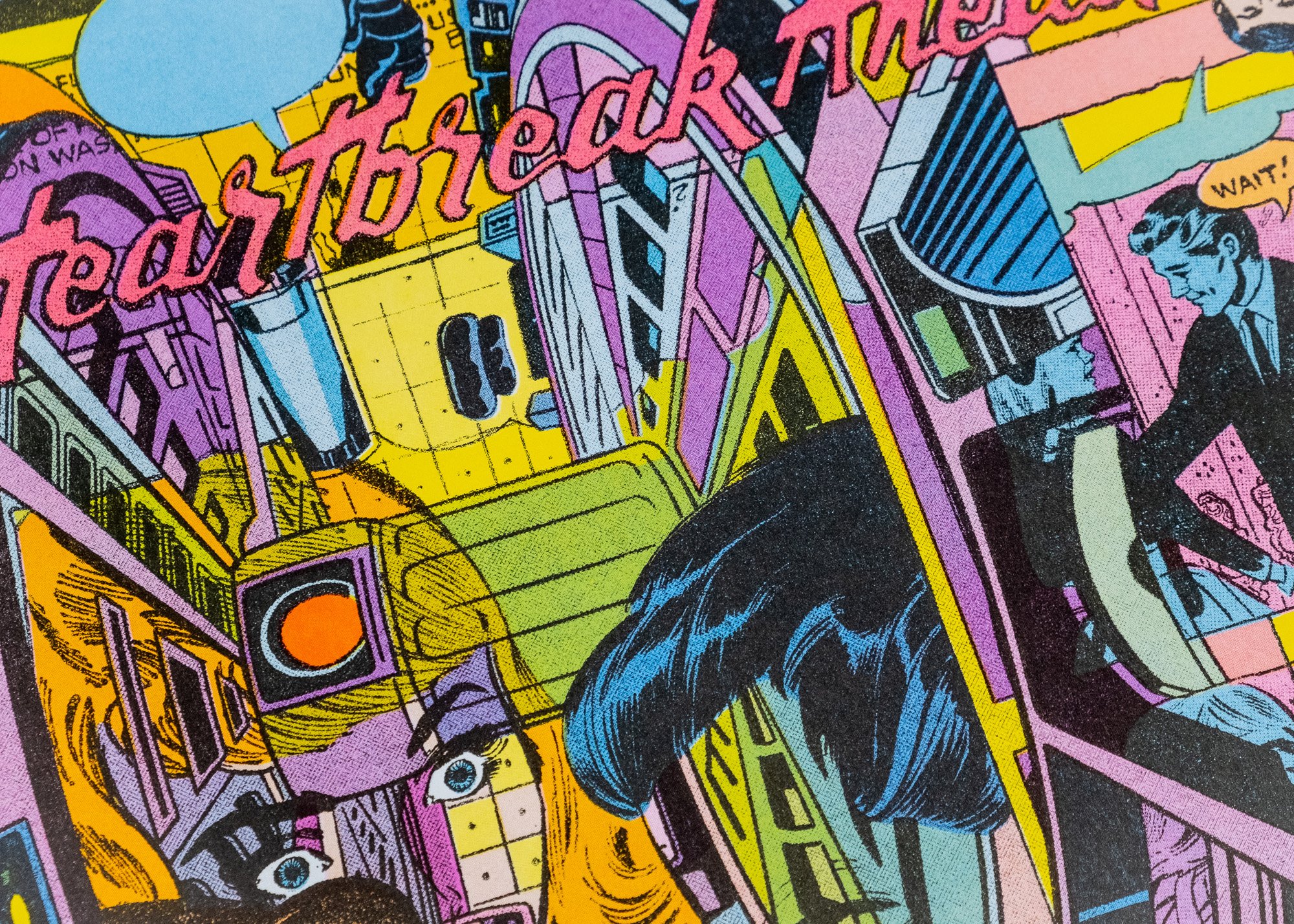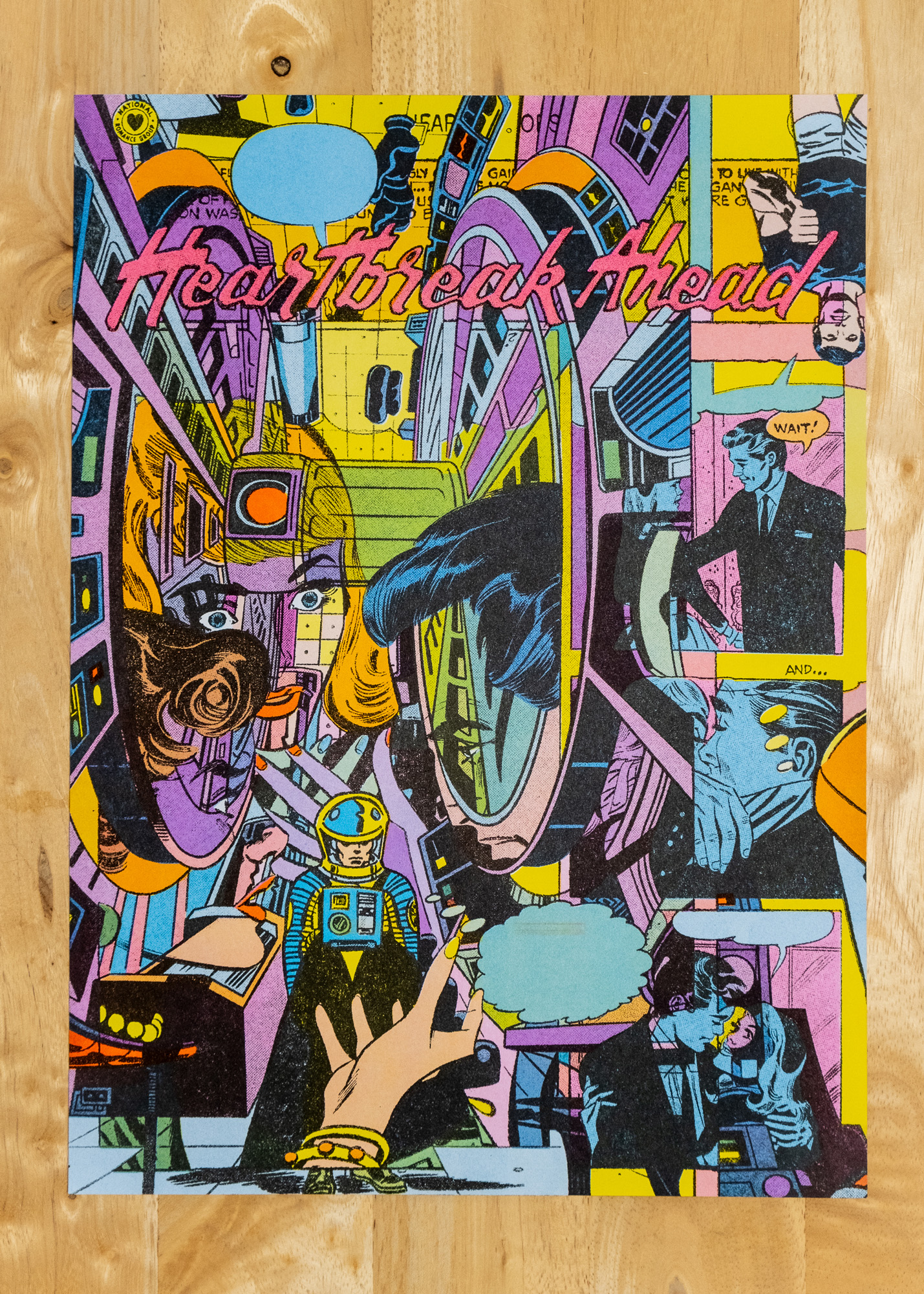 4-color Risograph print (yellow, flo pink, aqua, and black) made from a collage of vintage comics.