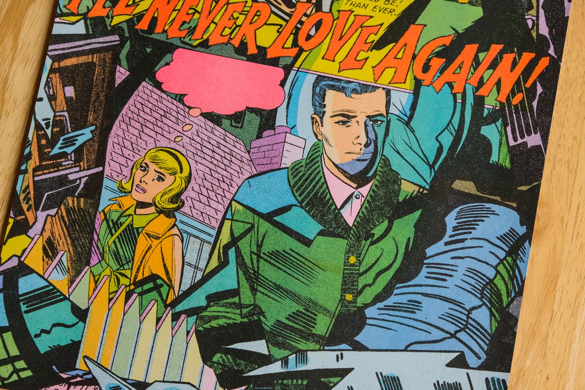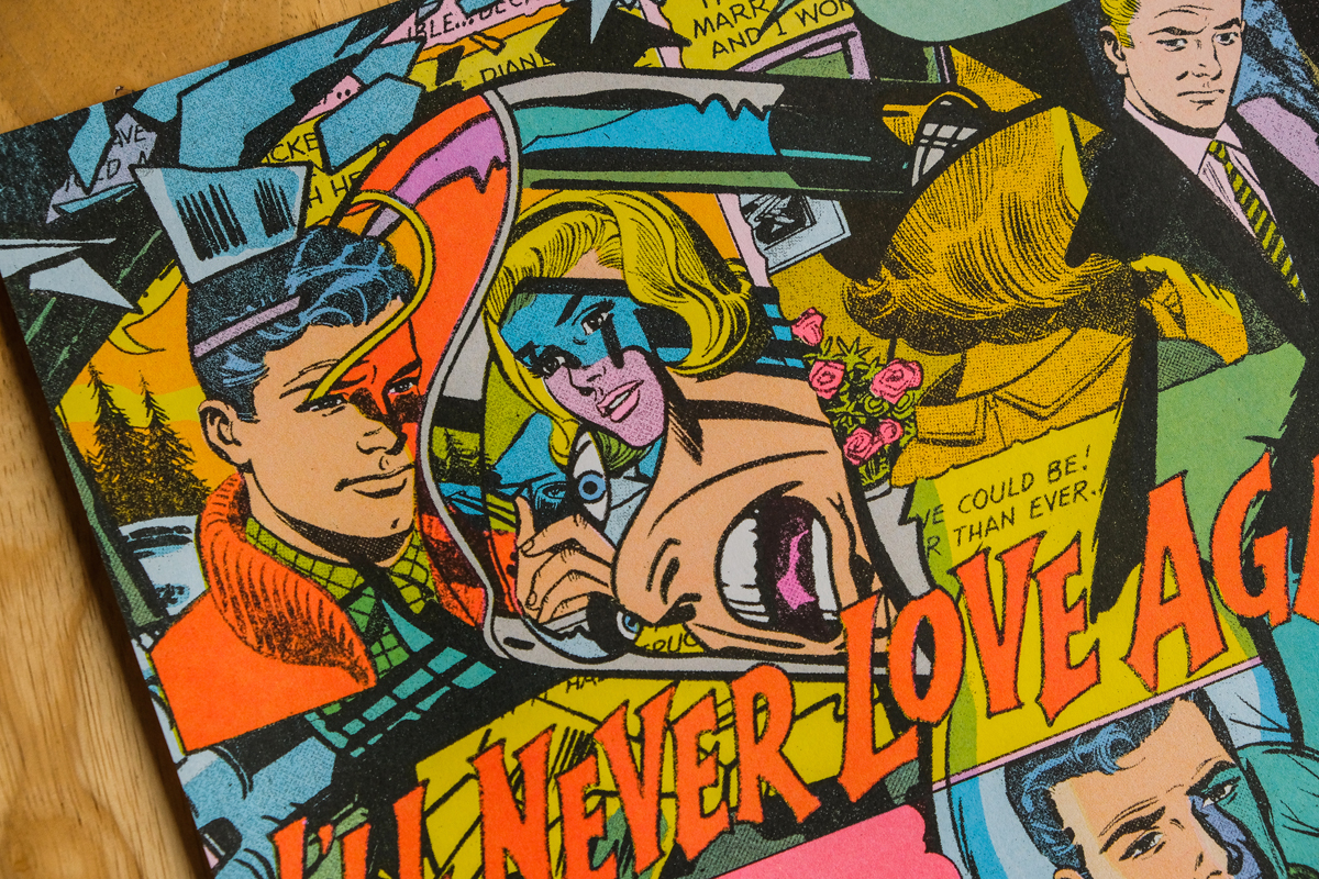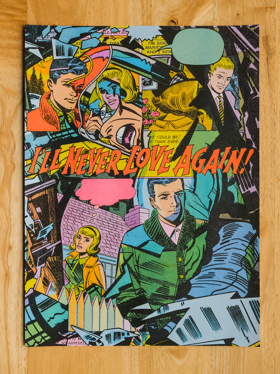 4-color Risograph print (yellow, flo pink, aqua, and black) made from a collage of vintage comics.